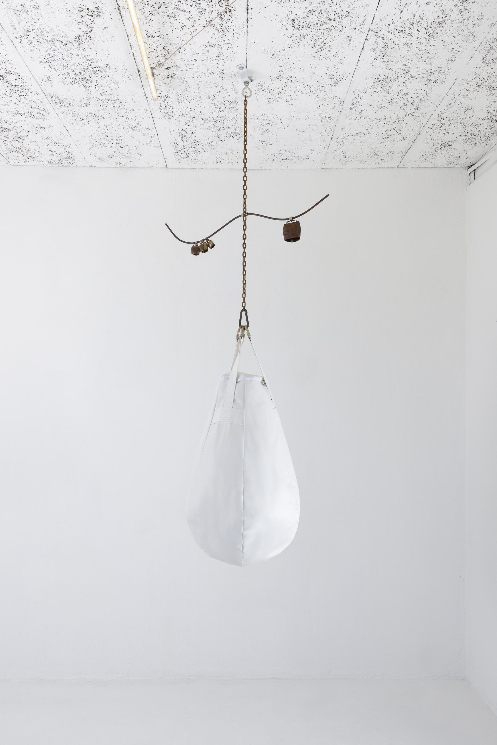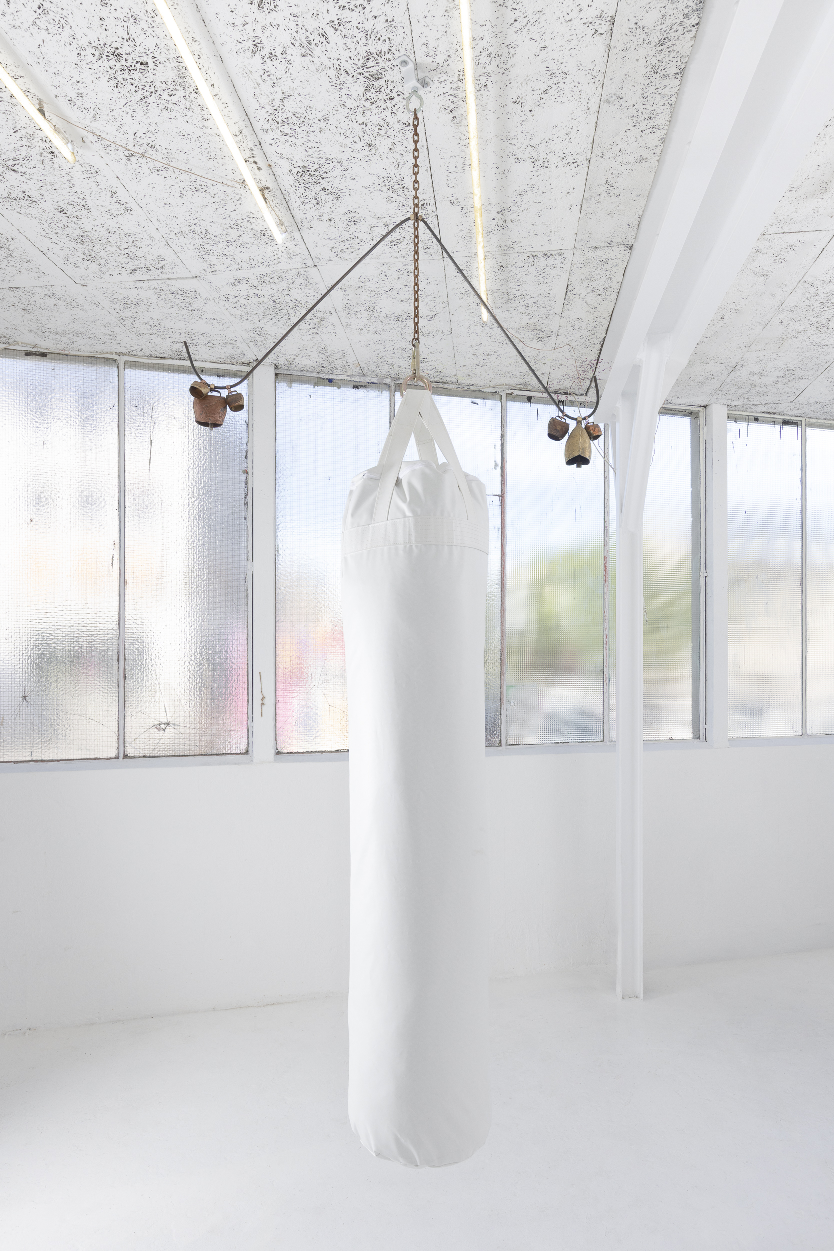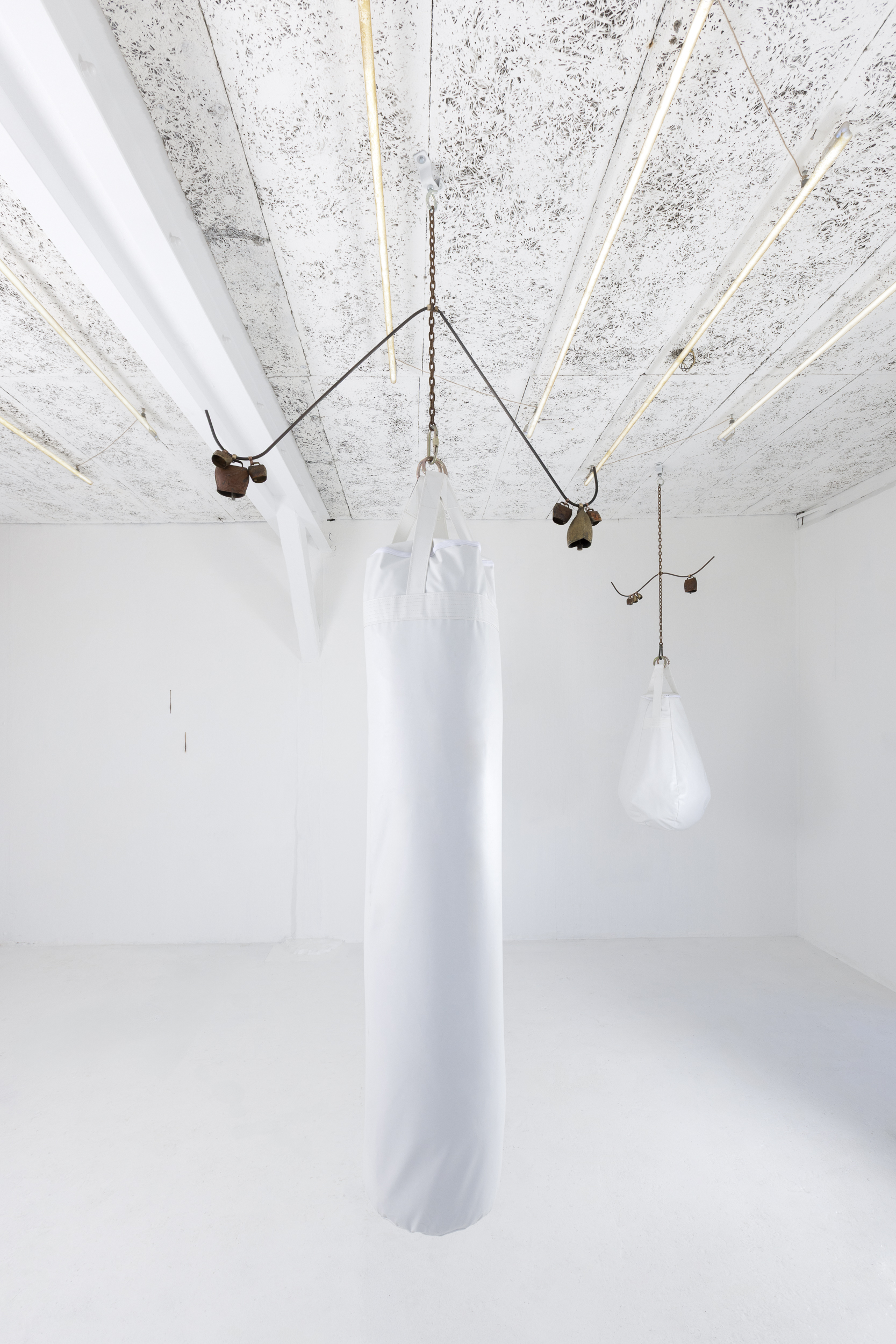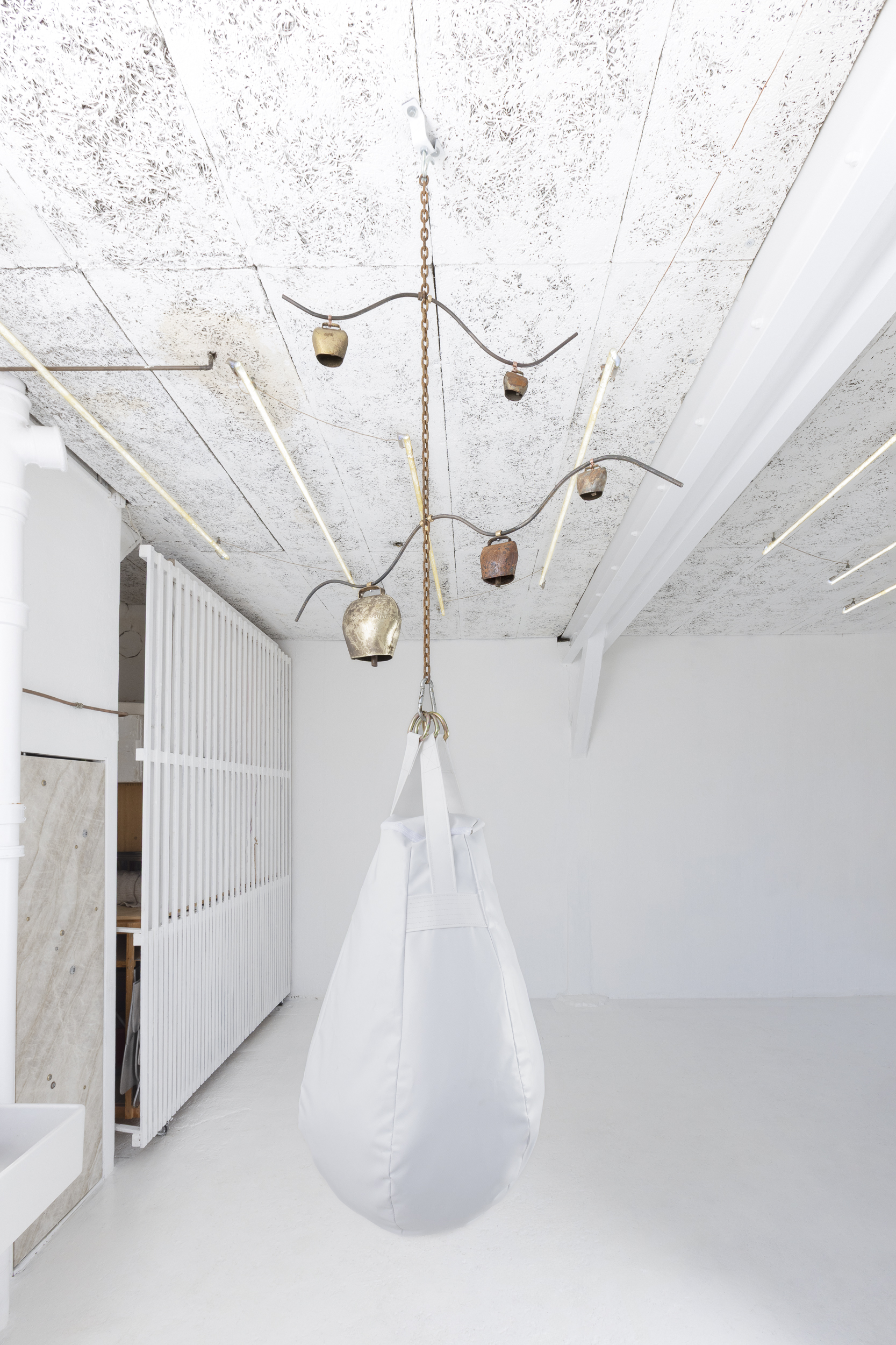 Hochet punching bags hang from the ceiling, topped with delicate brass structures from which bronze bells are suspended. Activated by the public’s blows, the bells ring out, recalling the sound that marks the pauses between rounds in a boxing match. If the punching bag evokes training, whether military or martial, here it becomes a percussive instrument. Most are teardrop bags, shaped like drops of sweat or tears. The work shifts an object of violence into a more ambiguous mode of interaction. If the bell usually signals the end of a round, or even the end of a fight, then in Hochet, each strike becomes a signal to stop.