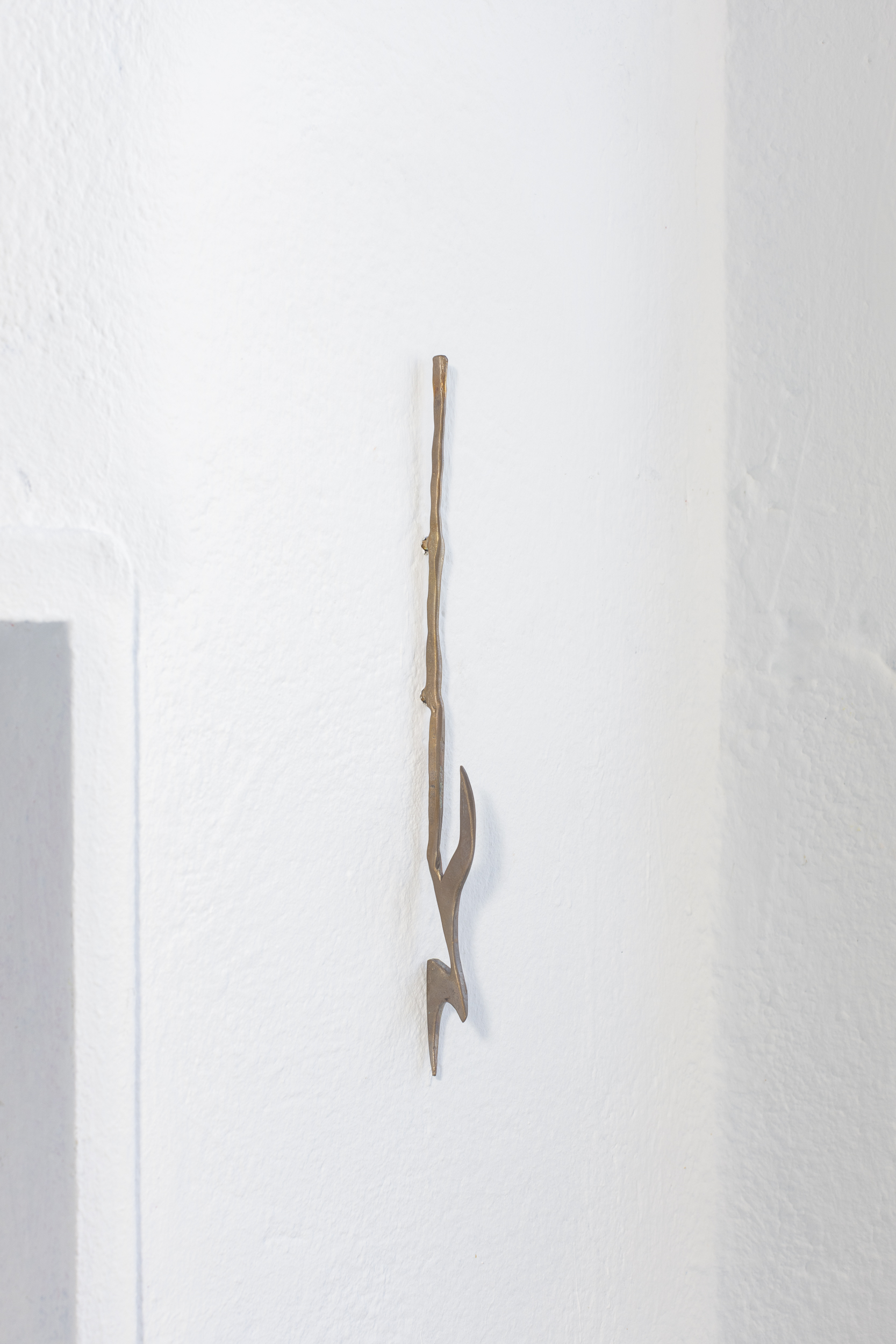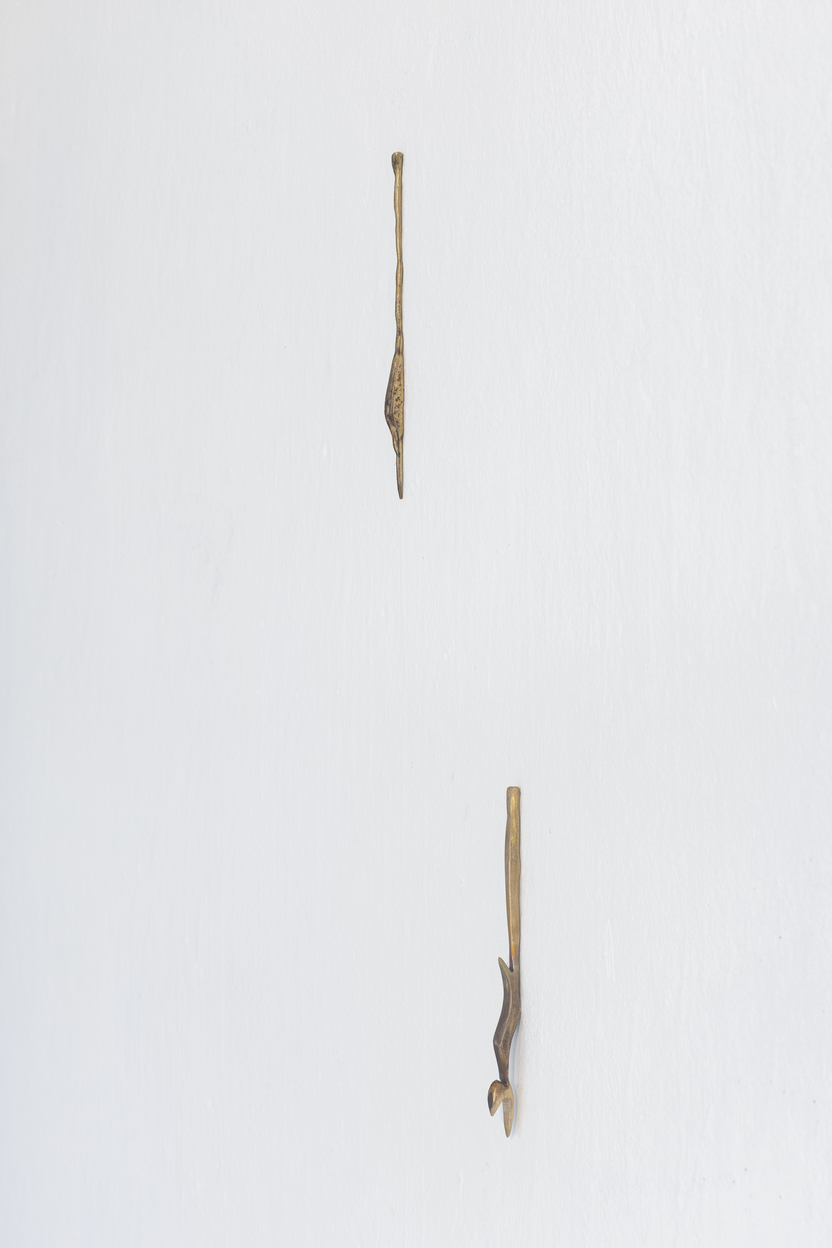 The piece restages the impossibility of violence, every attempt to hit immediately calls for its own suspension. Reading Wrong are small, wall-mounted pieces in patinated bronze. Shaped from flat metal bars, each ends with a musical rest, the symbol for a silence equal to a quarter note. Mounted directly on the wall, these works trace a form of silent writing.